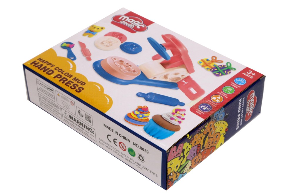 The Clay Set with Press Machine consists of 4 pots of colored clay, a press machine, 4 molds, a template ruler, roller, knife, plate, and a placemat.