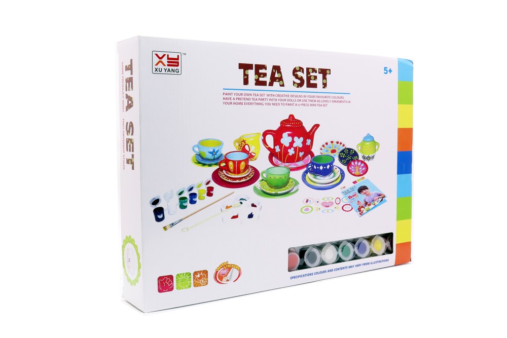 TEA SET PAINT YOUR OWN TEA SET WITH CREATIVE DESIGNS IN YOUR FAVOURITE COLOURS. HAVE A PRETEND TEA PARTY WITH YOUR DOLLS OR USE THEM AS LOVELY OMAMENTS IN YOUR HOME EVERYTHING YOU NEED TO PAINT A 17-PIECE MINI TEA SET